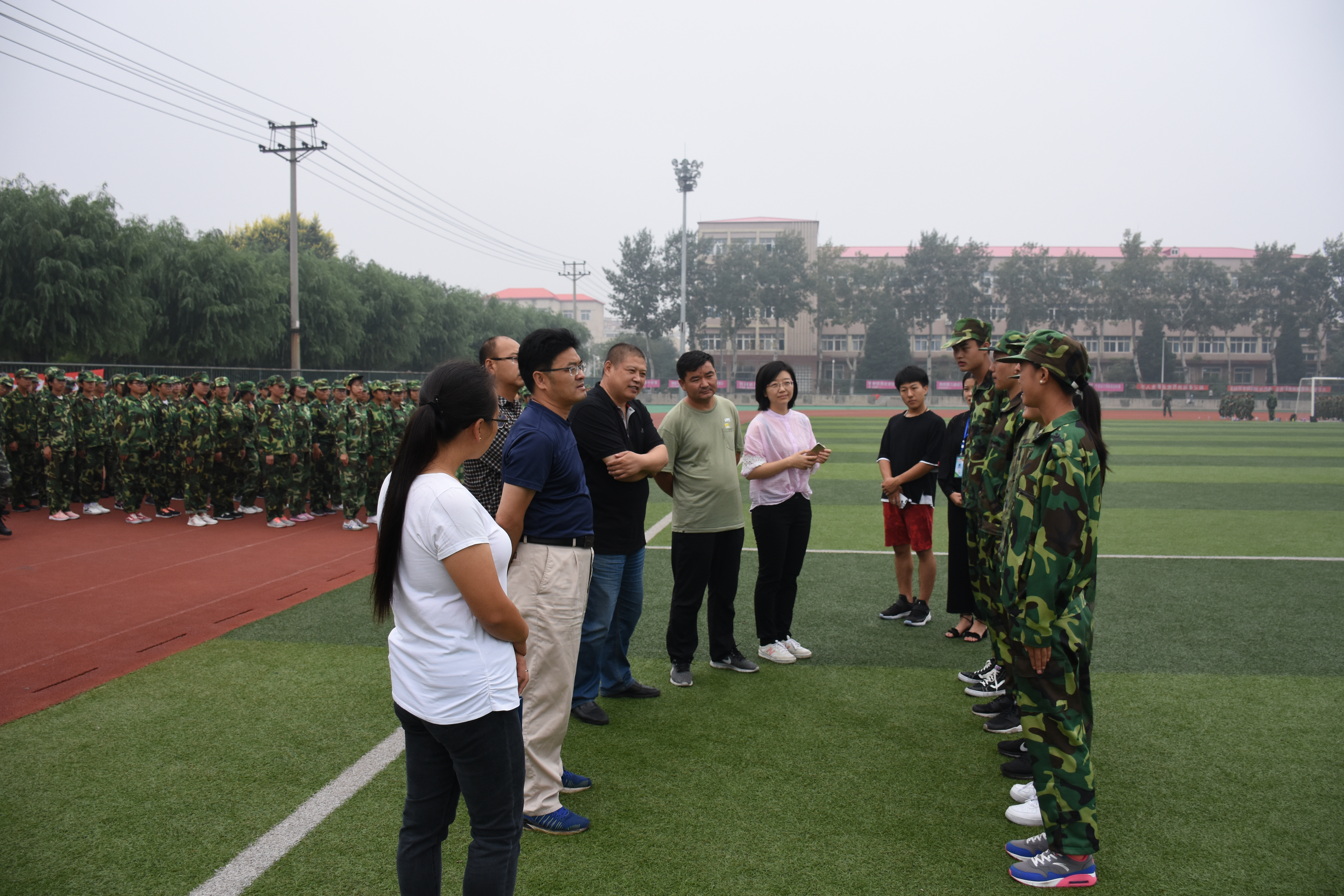 2018年9月14日,pg游戏电子模拟器有关领导、新疆籍内派教师吾斯曼·玉山、学工办工作人员以及部分2018级新生班班主任到军训现场看望了2018级参训新生。
