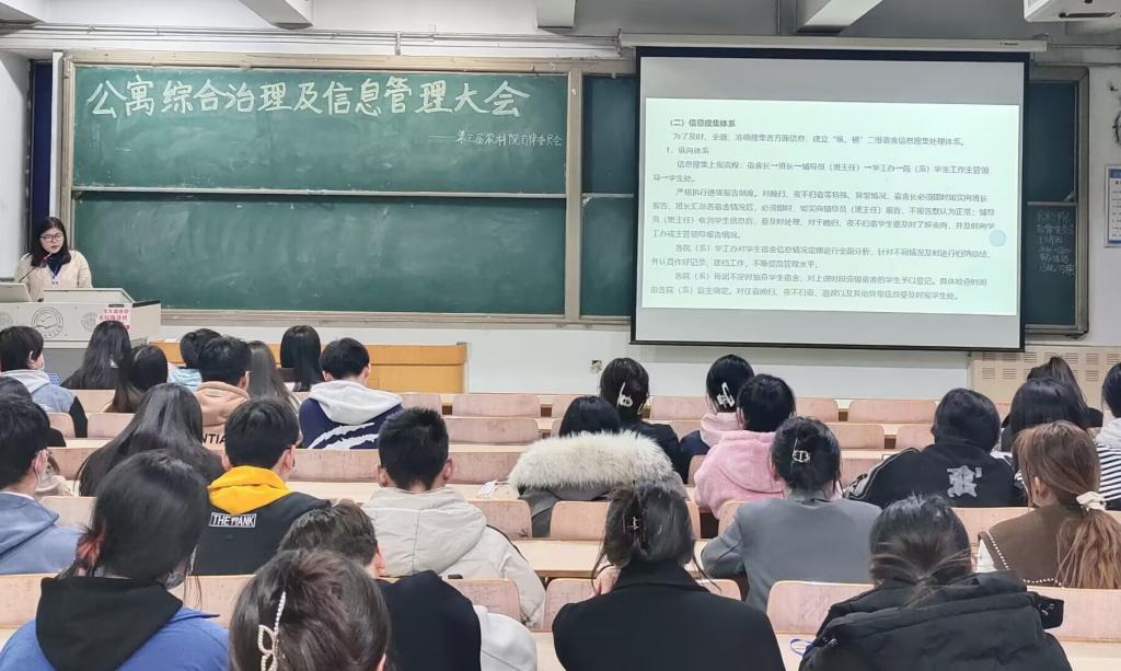 为了切实提高学院学生公寓管理水平,增强学生公寓信息搜集和处理能力,提升宿舍文化建设水平,2023年3月8日,pg游戏电子模拟器召开了宿舍综合治理和信息管理工作会议,主要就宿舍综合治理管理规定和宿舍文化建设等方面工作做了培训和交流。全院100余名宿舍长参加了会议。