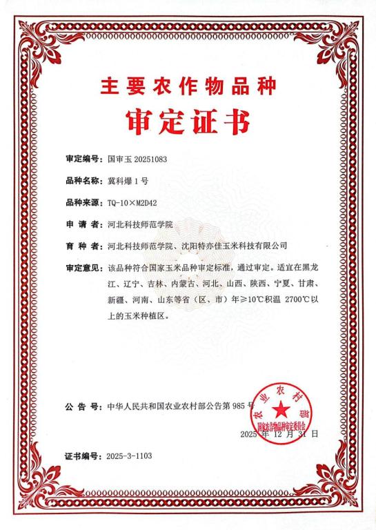 近日,中华人民共和国农业部公告第985号发布,由我校pg游戏电子模拟器王健博士领衔的特种玉米育种团队选育的“冀科爆1号”通过第五届国家农作物品种审定委员会第八次主任委员会议审议通过,审定编号为国审玉20251083。适宜在黑龙江、辽宁、吉林、内蒙古、河北、山西、陕西、宁夏、甘肃、新疆、河南、山东等省自治区年≥10℃积温2700℃以上的玉米种植区种植。这是河北省首个爆裂玉米新品种通过国家审定,也是我校有史以来首个国审玉米新品种,填补了我校玉米种质创新领域国审品种缺位的空白,标志着我校在玉米种质创新领域取得新突破。